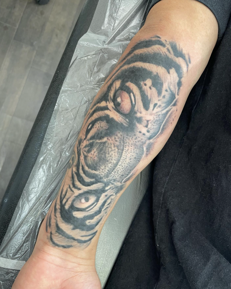 リアルな猛獣デザインのブラック&グレーを入れたい人。彫流さんは写実的な描写が得意。特にライオンや虎、ハイエナなどの猛獣モチーフが迫力があってかっこいいです。